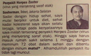 Pernah suatu kali saya menggaruk kaki saya yang digigit nyamuk, sehingga menimbulkan lecet. Beberapa hari kemudian, luka lecet tersebut membesar hingga akhirnya memborok. Makin lama borok tersebut makin lebar dan dalam, hingga tulang kaki saya terlihat. Dalam kondisi yang memprihatinkan ini, seorang sepupu saya memperkenalkan matol® dan menyarankan saya agar mencoba minum suplemen tersebut. Sayapun tertarik dan langsung membeli matol®. Setiap hari saya minum matol® dua kali yaitu pagi dan sore, dengan takaran 2 sendok makan sekali minum.