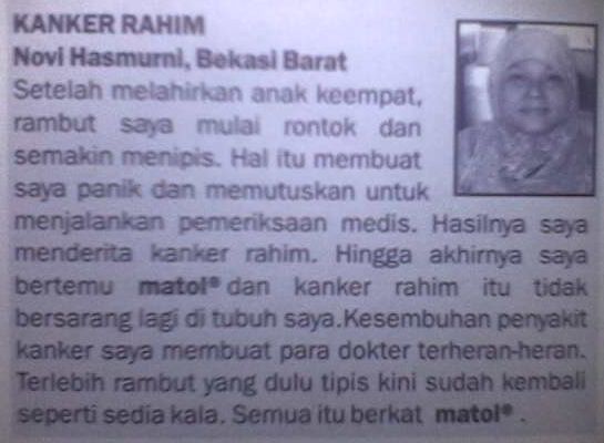 Terbukti penyakit kanker rahim saya sudah sembuh dan rambut saya sudah tidak rontok bahkan kini sudah mulai tumbuh. Kesembuhan penyakit kanker saya tentunya dari hasil akhir pemeriksaan kesehatan di Laboratorium yang menyatakan bahwa rahim saya sudah sembuh dari kanker. Kesembuhan penyakit kanker saya membuat para dokter terheran, bahkan menanyakan sebelumnya saya berobat kemana? Saya hanya memberikan brosur matol® untuk para dokter-dokter itu. Mereka pun terkejut bahwa jamu matol® ini memang sangat berkhasiat, salah seorang dari mereka pun menjadi anggota pada saat itu.