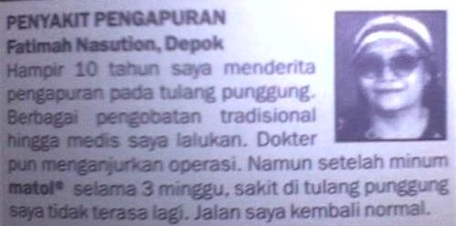 Namun upaya tersebut tidak membawa hasil berarti. Terakhir, dokter mengatakan bahwa saya harus menjalani operasi ginjal. Hal itu membuat saya semakin takut dan khawatir. --- “Keluhan berkurang setelah 2 minggu minum matol” : Suatu hari, seorang langganan yang memasok telur ke warung saya, memberi sebuah brosur matol (kebetulan saya membuka usaha warung). Setelah membaca brosur tersebut tanggapan saya memang biasa saja. Namun hati saya mengatakan, apa salahnya mencoba minum matol. Akhirnya kami memutuskan untuk membeli dan mencoba matol. Kurang lebih 2 minggu pertama minum matol secara rutin, muncul kejadian yang mengagetkan : Air seni saya tiba-tiba terlihat seperti darah kental, bernanah dan bau sekali. Syukurlah, hal tersebut hanya berlangsung 3 hari. Selama itu pula saya tetap minum matol.