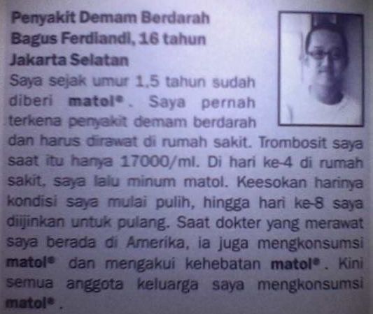 Beruntung Ingat matol Sejak 1998 lalu saya giat berbagi cerita / sharing tentang matol kepada orang yang saya temui. Meski awalnya cukup sulit namun akhirnya saya menjadi terbiasa dengan sistem MLM yang diterapkan dalam bisnis ini. Berbagi cerita tentang matol selanjutnya menjadi hal biasa bagi saya, meski terus terang waktu itu saya belum pernah mengkonsumsi produk tersebut. Hingga suatu hari, sekitar tahun 2001 anak kedua saya yang saat itu berumur 3 tahun mengalami panas badan yang sangat tinggi, disertai keluar bentol-bentol yang terlihat semacam alergi di sekujur tubuhnya. Ia tampak sangat tersiksa karena bentol tersebut menimbulkan rasa gatal yang luar biasa. Guna mengatasi, saya memberikan obat penurun panas.