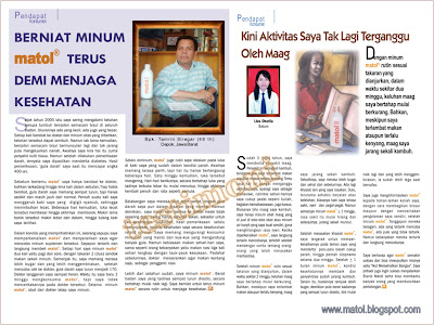 Selain itu, minum matol membuat saya merasa jauh lebih sehat dan bugar. Saya juga lebih tahan/kuat berjalan jauh. Sebelumnya, saya hanya tahan jalan kaki paling lama 2 jam. Kini, meski sudah berjalan hingga 4 jam saya tidak merasa lelah. Saya juga tidak mudah kedinginan atau masuk angin. Sebelumnya, kalau kena angin misalnya naik kendaraan, apalagi rambut basah karena kehujanan, besoknya pasti sakit. Kini, bukan hanya ibu dan saya yang minum matol, tapi diikuti pula oleh saudara saya lainnya. Saya juga tergerak memperkenalkan matol dengan memberikan brosur kepada kerabat, teman serta orang-orang di lingkungan saya. Saya juga menyarankan pada mereka supaya mengimbangi dengan pola makan sehat dan berimbang.